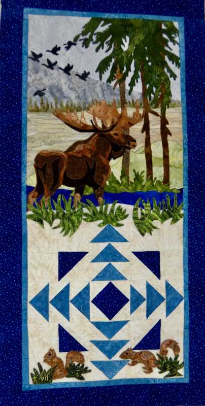 I also took time out from double nine patches to do an art quilt wall hanging. I used Toni Whitneys moose from a pattern I bought a long