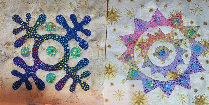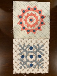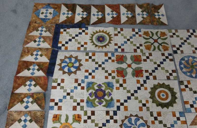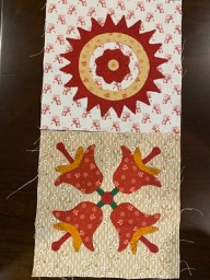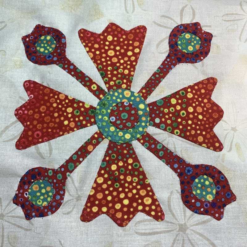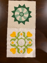 some applique blocks. Have not figured out exactly what I have in mind. Will use black sashing strips to make things fit together. The fabric, except the jet black kona