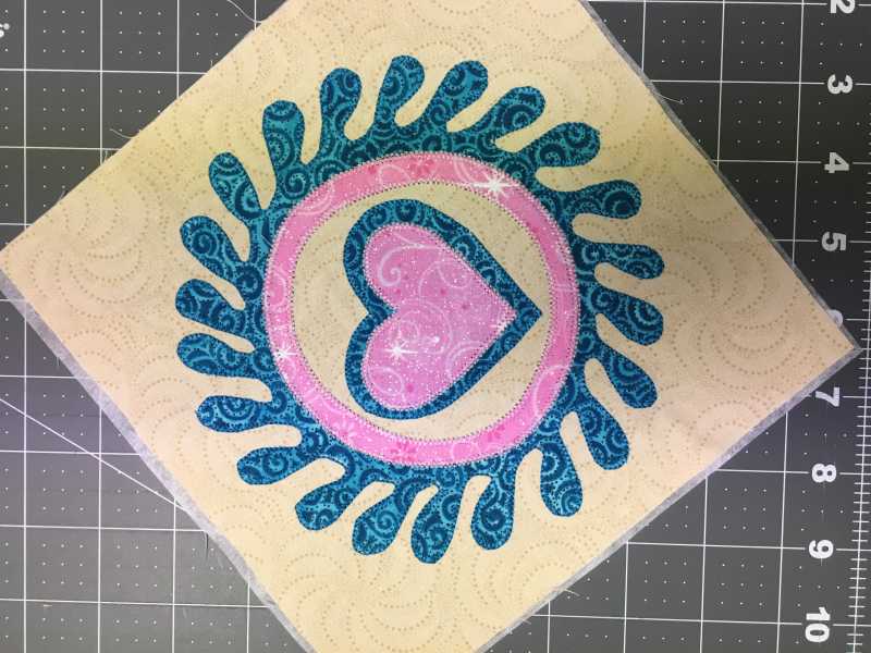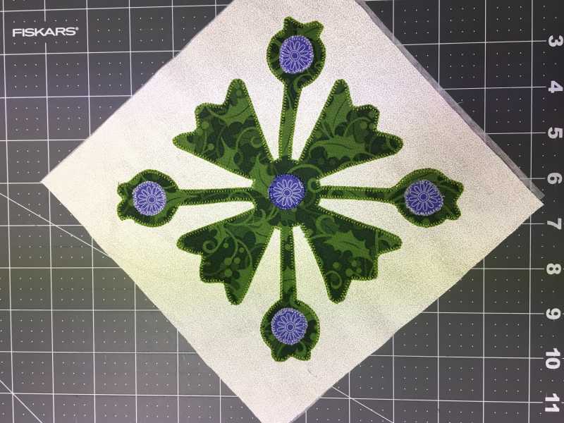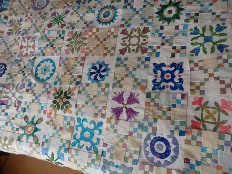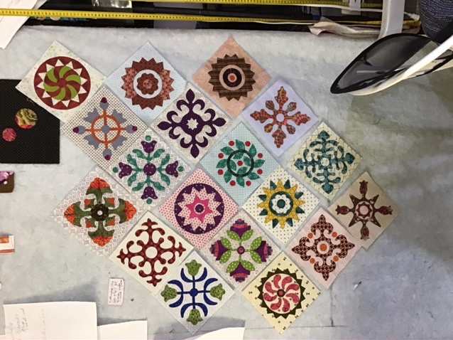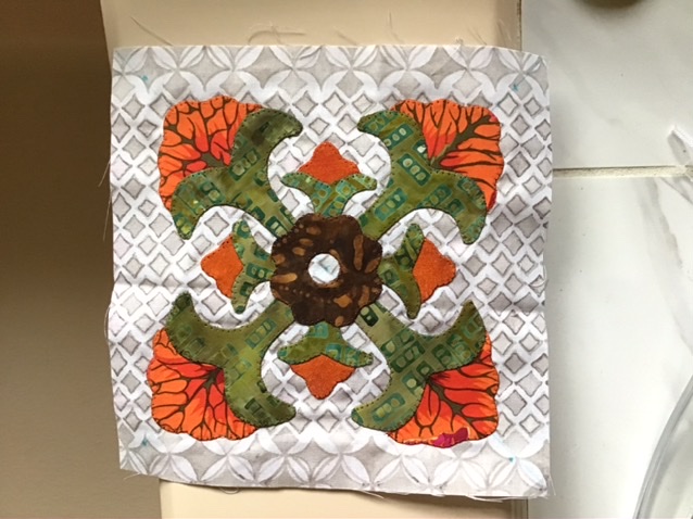 I can't believe I caught up! I traced Sept. and Oct. appliques one day, chose fabrics and prepped another day, this morning I turned under edges, and I just finished the blind applique by machine. Hurray! A few days break before the November six!