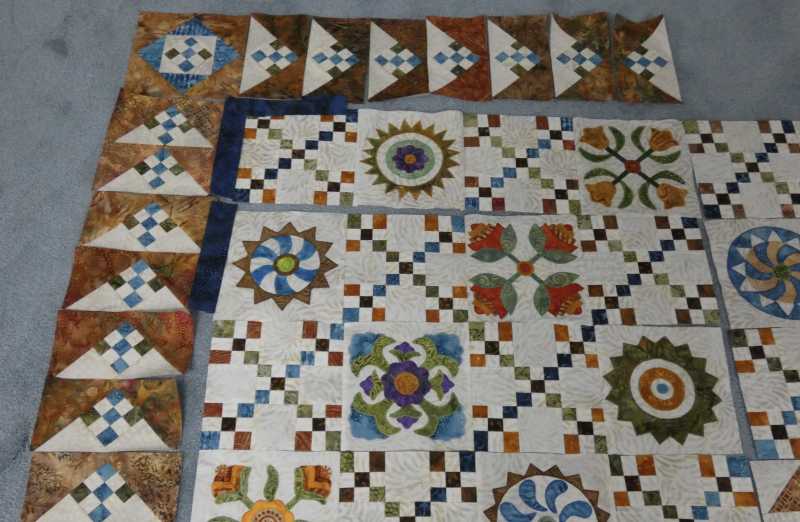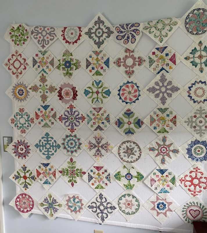 I have not been able to work on mine for over a month due to other projects that jump to the front of the To Do list, but mine has a similar color palette to andI plan to do a horizontal layout rather than on-point. HelenW