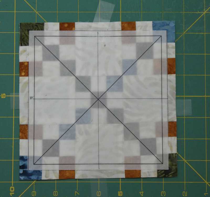 Cheddar, Definitely read Barbara's blog. This is a picture of how I did it. I drew the finished size and added the seam allowance, and then made horizontal, vertical and diagonal lines on tracing paper. You can see thru it. Placed it on the block, laid my ruler on top of the tracing paper and cut. It would also work for the applique. I used a different methodOriginally posted by "cheddar" post=151898Mergwat, admiring your stack. I’m at this point and feel cutting them to size is the hardest task keeping the motif centered