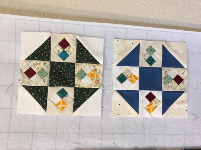 Looking at the finished quilt photo, it doesn’t seem to make much difference what direction the four-patches are oriented, however, I looked closely at Sue’s quilt, and like the way she oriented all of hers to sort of cross the shoo-fly. I haven’t started on mine yet, but hope to have all nine done this month!