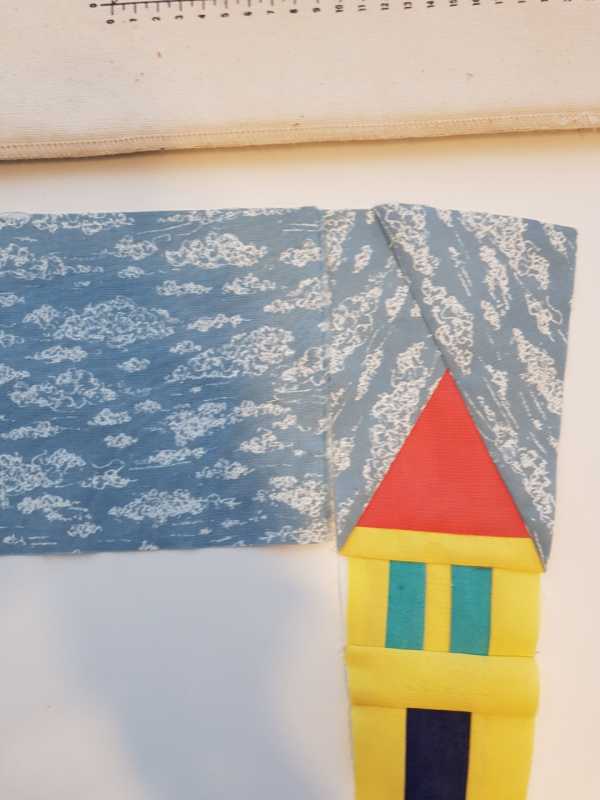 I made one house with clouds. Unless you fussy cut the pieces to orient them so they are end up being hofizonal you'll end up with the background lines going in directions you may not like. I choose a sky blue solid for small house sky/background. I didn't want to take the time to get my clouds going in the direction I wanted them to go.