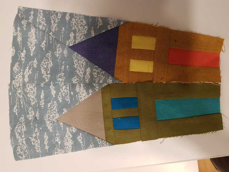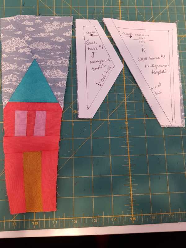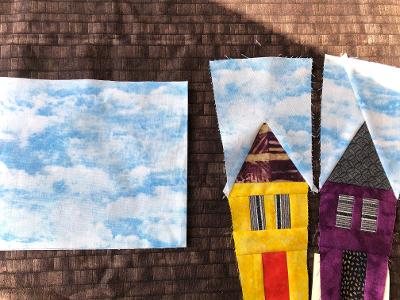 I am using sky fabric for the background. I tried to do it in one piece , using a Y seam but I think the roof angle is too acute. Using two pieces in the background disrupts the clouds. Any tips?