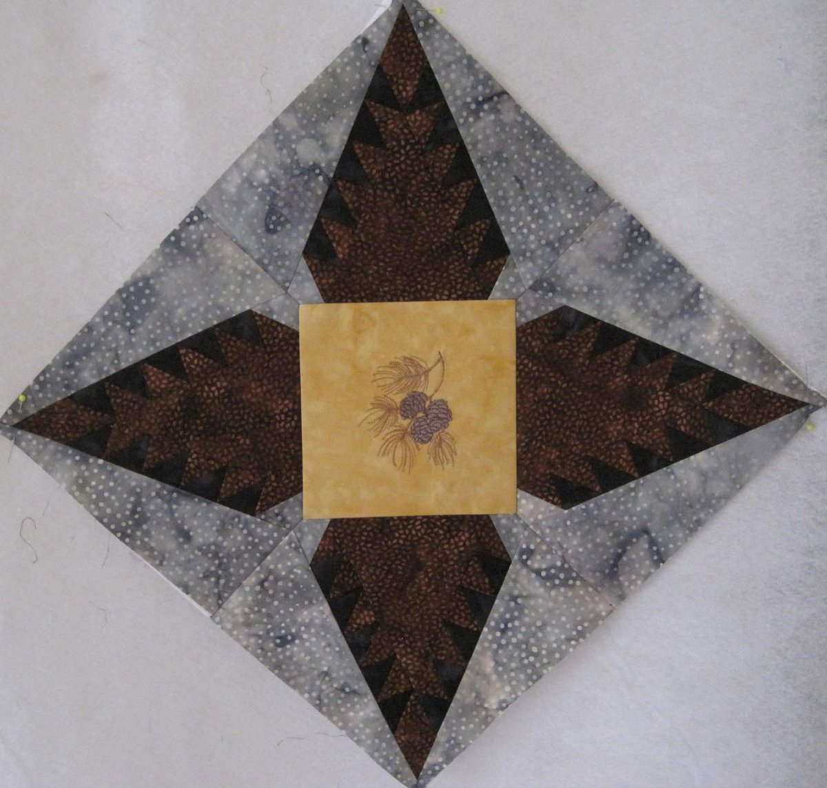 Ok, I finally finished the center block. My theme is Trees, so I started with a block called "Pinecone". I found this in Jinny Beyer's new book of blocks. I drafted 1/4 of it to 7 1/2" finished, 8" unfinished and made four of them and sewed them together. Each block was foundation pieced to Ricky's stable stuff. I used my window to trace from my drawing to the stable stuff. I had to adapt the block a little to fit my needs. I used my embroidery machine to embroider the pinecones in the very center and then set that yellow center block into the center of the other 4 pinecone blocks. When I was done I was very pleased, but it sure wasn't very nice looking! I mean, grey and brown and black? For a green quilt? But I stayed calm and remembered there is a lot more to do!