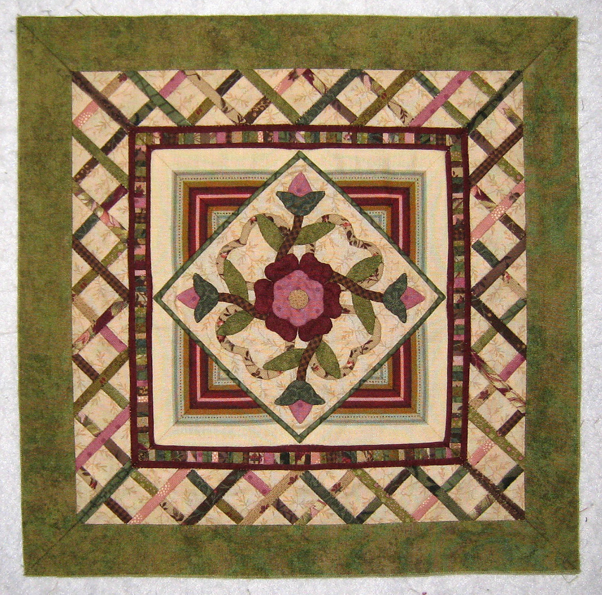 The checkerboard squares are 1/4". I didn't use starch and almost never do. I've used Best Press a few times when fussy cutting which results in bias edges because I won some at a Quilt Show a few years ago. I've never purchased any. I always use steam unless I'm working on paper. I've learned to press only the seam and not the whole block by just using the edge of the iron. I like an iron with a sharper edge instead of rounded. I cut the checkerboard strip on the crosswise grain because the dimension that direction gave me the length I needed in order to end with the dark square at all corners. Those squares aren't perfectly square. I cut the floaters on the lengthwise grain and sewed them to the checkerboard strips first on the checkerboard side. I cut them wider than needed and trimmed them to the right size before sewing to the center and lattice border. After sewing the lattice into groups of 4 with a scant seam allowance, I squared them again to get an exact 2 1/2". I used Sue's instructions to sew with the presser foot against the previous seam when adding the floaters to the center and lattice border. I learned to do that a few years ago when I started making miniature quilts. The second floater was wider than 1/4" so I adjusted the needle to get the right width. I use an open toe applique foot whenever I need to see what I'm doing. My machine doesn't have a 1/4" foot with enough space in the middle like the Bernina. That's the only complaint I have on the Pfaff machine that I use for all of my piecing and I also always use the dual feed.Originally posted by MargoAnnis, I have a few questions for you. What is the finished size of each checkerboard square? Are you using starch during construction? How about steam?