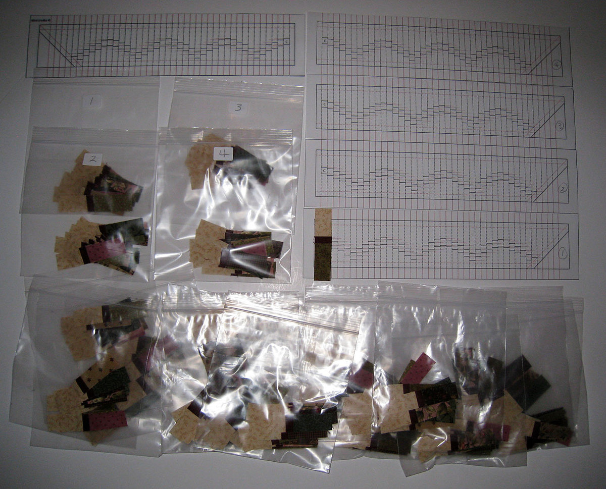Now I have 20 packages of 15 strips each. I will be working with 4 packages at a time, one for each side of the quilt, starting from the center and working my way to the right. That will ensure all of the fabrics will be distributed evenly. As you can see I already positioned the first one wrong. The dark is supposed to be up. No need to retake the picture. We all make mistakes. As long as I don't make any as I sew because these are going to be a challenge to keep lined up. I will be trimming away some of the excess fabric from the top and bottom before sewing and working from the front so I can see what I'm doing. I wonder how long it will take to sew all of these pieces together! I hope I like the finished results.