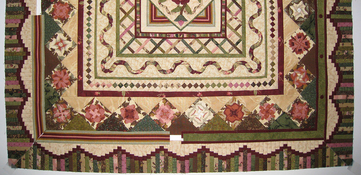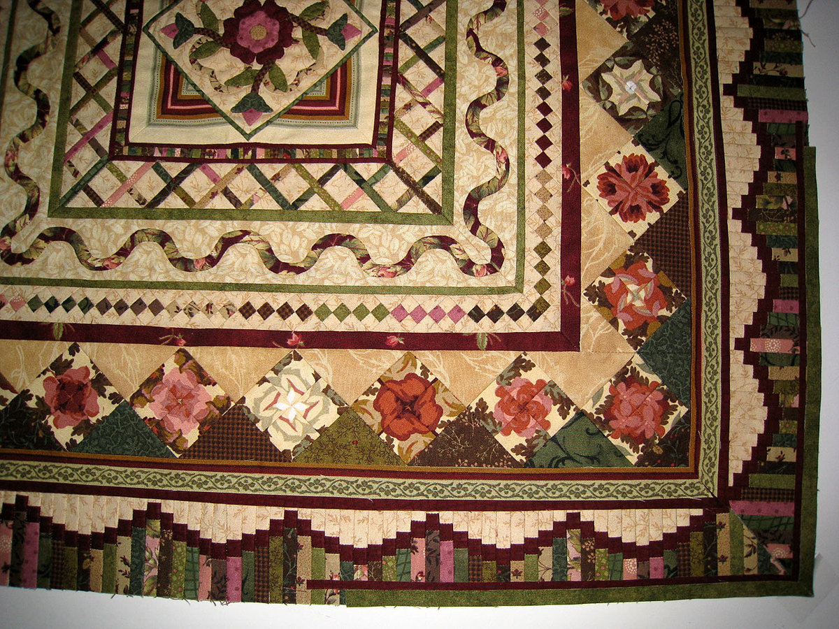 Which one? The striped fabric on the left or the triple border on the right. And do I have to make the 28 appliqued circles! I have a little over 3/4" to work with so the green strip on the right would be about 1/2" wide which would mean the circles should probably be 1/4". I'm not sure that I want to do those but I have too much time in this quilt to take the easy way out. Any suggestions will be appreciated.