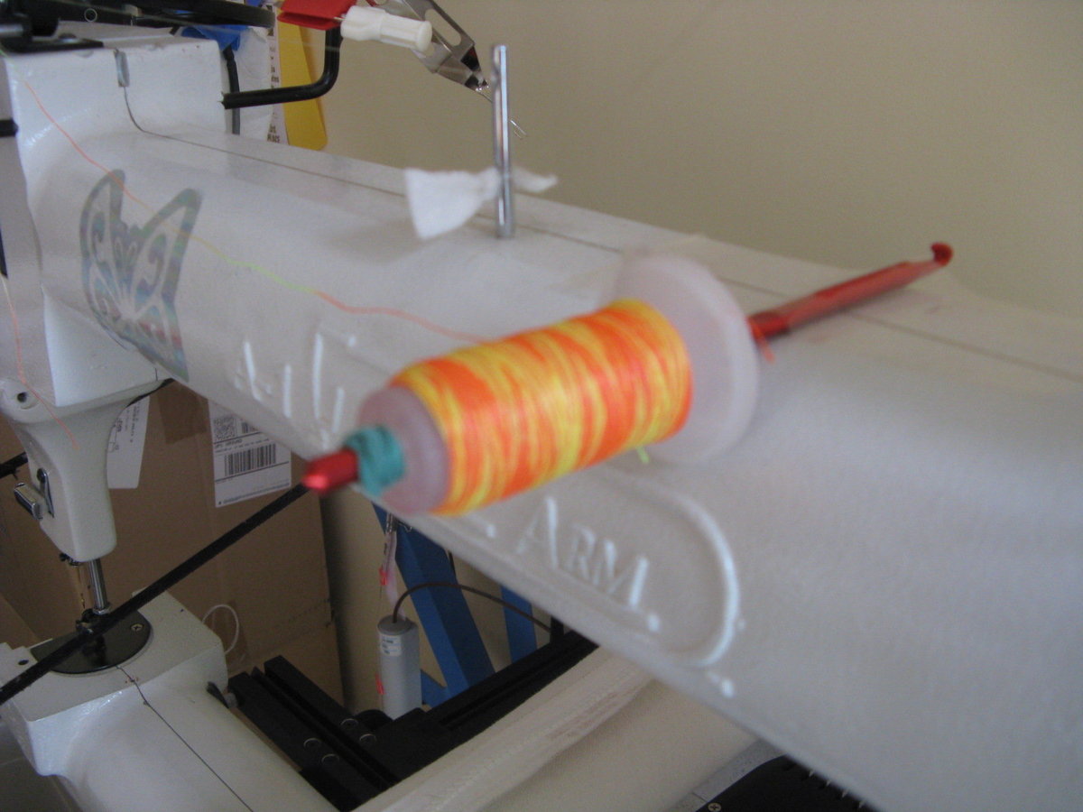 Originally posted by heartnsoulquiltsCarolyn, I have used clear packing tape and a crochet hook to tape a horizontal spool pin thing on my longarm when I need it. I don't see why you couldn't do that on your Grand Quilter. I lay the crochet hook with the hooked side not sticking out, perpendicular on top of the longarm and tape it down so it sticks out enough to put the spool on it. Then I push a paper clip over the end of the shaft of the crochet hook and push it up to meet the spool to keep it in place and stop it from spinning. Works a charm!