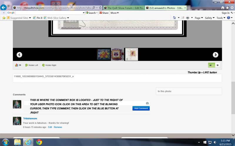 Did you scroll down below the photo to see the "Add Comment" box? You'll see your photo icon and there is a box to type in your comment just to the right of that. Unfortunately, there is no line surrounding that box, but it is there - just click a bit to the right of your photo and a cursor will blink which indicates you can type your comment. When finished typing, click on "Add Comment". Hmm, better alert Bob, webmaster, that we need a line around the box so you can see it!Originally posted by "twiglet" post=130724There's no place to leave a comment which is a shame