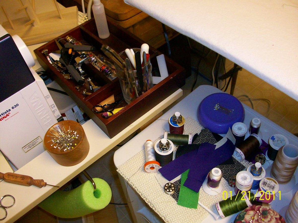 Margo, what spills over to another surface for you ends up on the right of my cutting surface, but right now it's on top of a box on the floor because a friend spent the day with me sewing and I moved the cutting surface to another room. A magnetic pin holder and a pair of scissors is all that is to the right of my sewing machine right now as it's still in the other room and I'm getting ready to pack it up for a class tomorrow. Thanks for the challenge. Maybe tomorrow I will get things back in order after the class.
