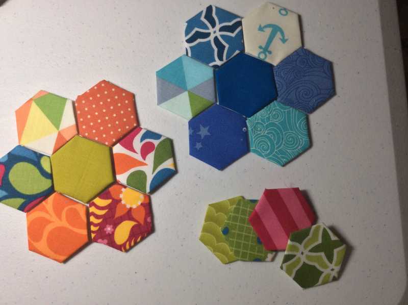 The hexagons are all 2" so I have been using the mini pack of alreay cut fabric, they are the perfect size, I think as I do them they are getting easier.