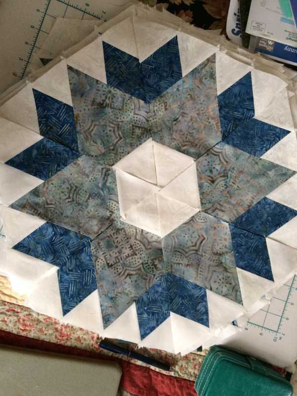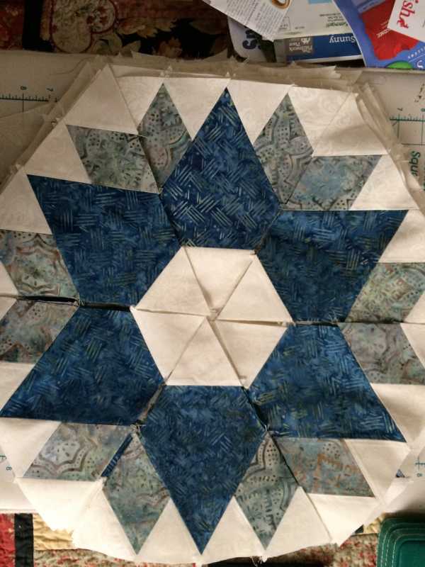 Last night and then today I was able to get another four blocks done and pieced together. Right now I have my sewing machine in the middle of the living room..so tonight it goes back up to the sewing room. While my husband was out of town it was easier to have it here. Grandma was working on her laundry and needs assistance. We also have two dogs that I have to walk at least six times a day. Husband wants the house cleaned, so up goes the sewing machine and fabric. This weekend we will be traveling to Branson, MO about 3.5 hours away. So out will come the hand piecing Hexagons to fill in the time. Our friends own a condo down there and she and I will be coming up with the colors to make a wall hanging. Hopefully we can pull from all of my batiks to get the right matching fabrics.
