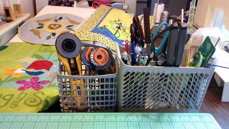 I had to get a new dishwasher recently & knew there had to be another use for the utensil baskets. I use them to hold my scissors, cutters, pencils, etc. so they are handy near my machine. Easy to carry from one place to another... also easy to put back the gadget back where it belongs.
