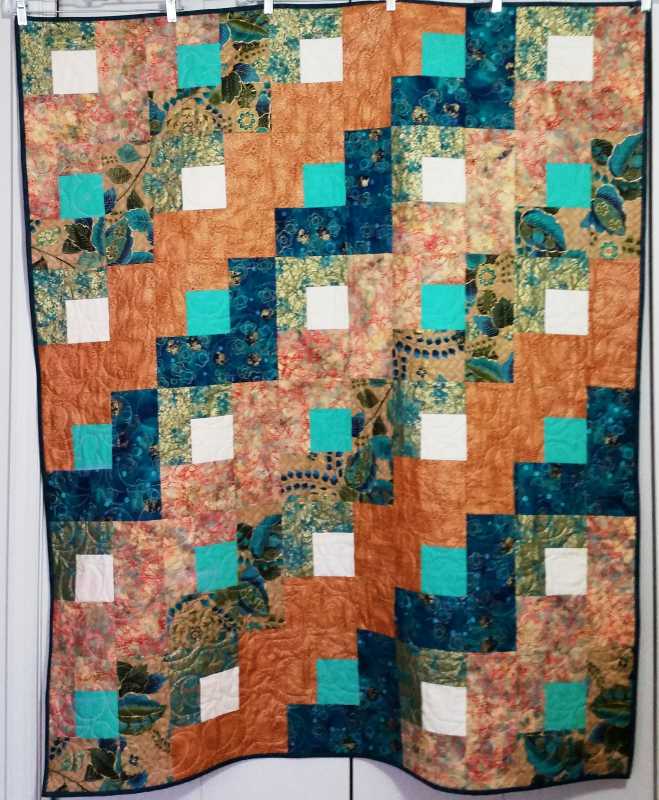 It's a lovely quilt Renata. The colours compliment each other so well and the quilting looks flawless. I really like the design you chose - both quilt pattern and quilting. I also really like the alternating white and turquoise squares in the centre of each block. What a lovely gift for your neighbours. :cheer: