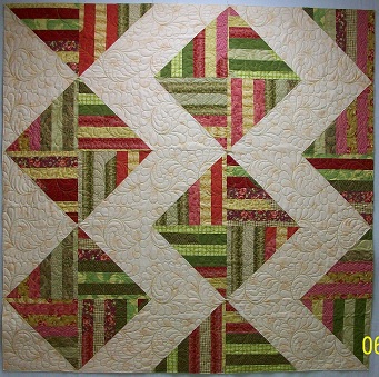 I wanted to try the 1600 type quilt, but didn't want to purchase a jelly roll, so I just cut strips from my stash. It worked fine, but I was just not happy with the plain strips sewn together. I cut the resulting panel into LARGE squares and made them into HSTs and created this quilt! It might be a fun activity/challenge for a guild to see what they can make out of the pieced 1600 top!