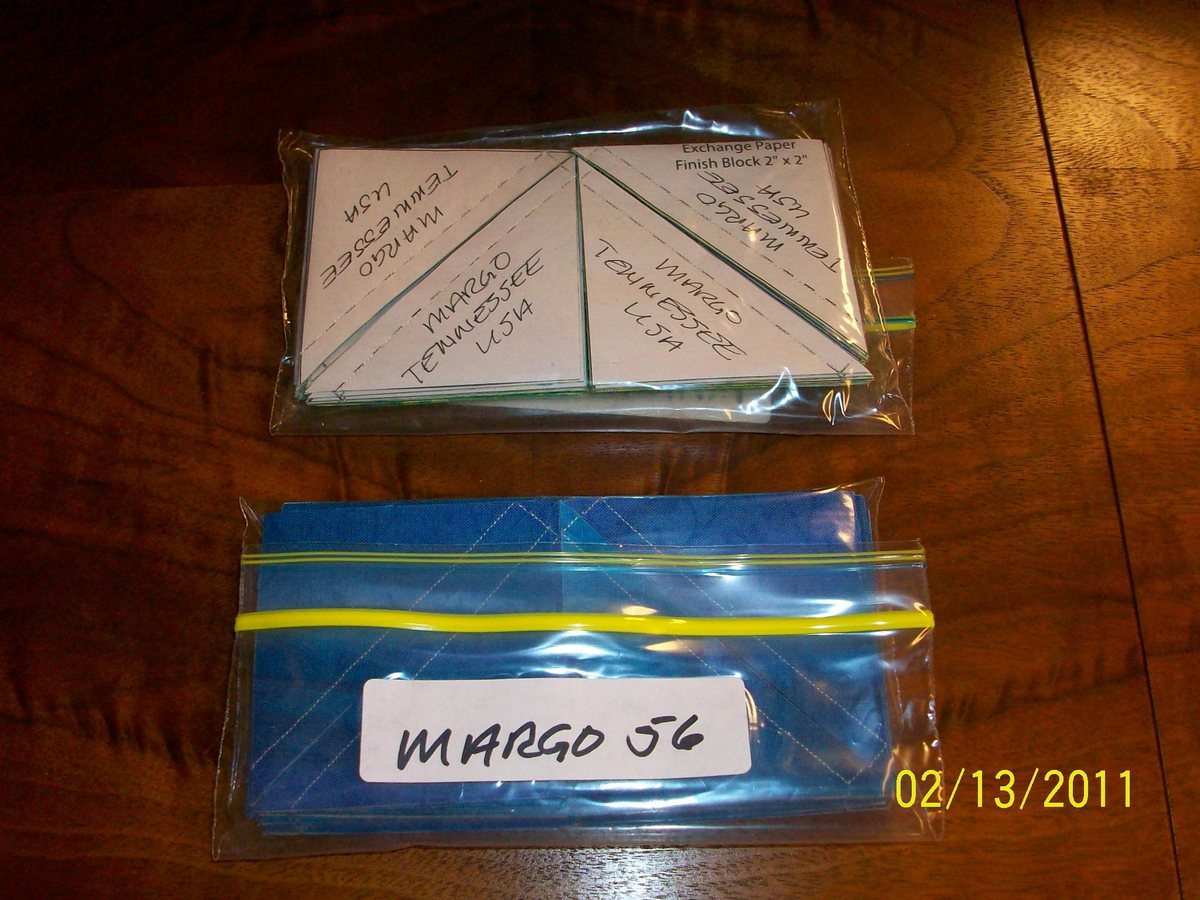 Margo, Thank you for posting a photo of your HSTs in baggies. It was helpful to see that visual. I had already packaged & shipped mine to Ritzy, but it will be quite useful for the Sisterhood triangles since there are so many more triangles to ship.