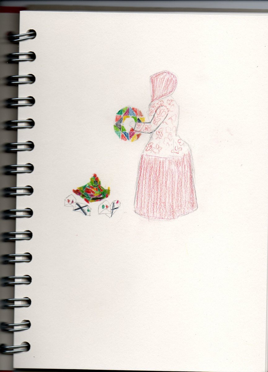 it shows a 1640s(ish) silhouette making one of the hats, with the other hat on the floor, with 4 envelopes to show that 4 other ladies helped with hst's, 2 of the envelopes have saltires on them to indicate Scotland, but I got the colours totally the wrong way around