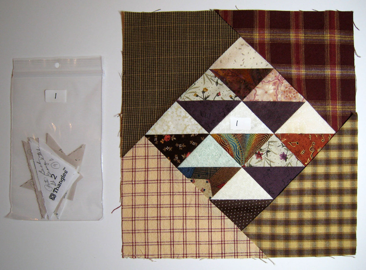 I had some unexpected free time this weekend so all of my HST's are now sorted for 48 blocks. I've decided to make a rag quilt instead of my original idea so it will go faster and I can quilt it myself. I don't expect it will be ready as a prototype though but I should be able to finish it by the end of the year. My BOM's will just have to be postponed for awhile. I numbered the papers on the back of the HST's from 1 thru 9, and I'm numbering the finished block and putting the papers for each block in a separate baggie. Now I will know which paper goes with each HST without a lot of work. My first block is now sewn except for the corner triangles. They will be sewn to the block after it is layered with backing and batting for quilt-as-you-go. I have all of the corners and backing squares cut. I just need to find enough of the same type of batting scraps to cut. I will not have to spend any money on this quilt except maybe for thread for quilting. It sounds like I need to find out what a Steady Betty is!