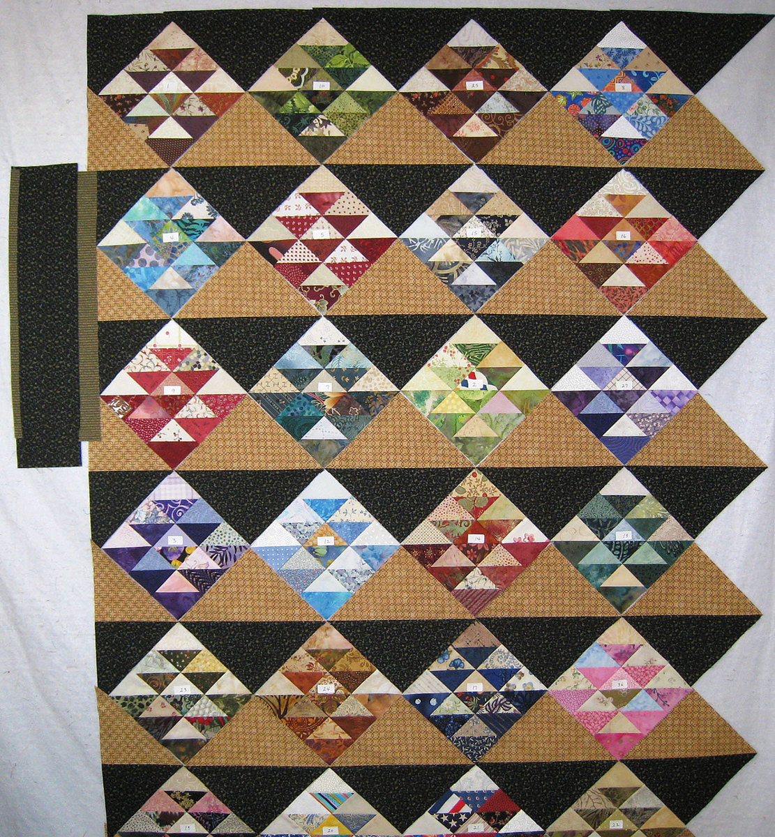 Does this look any better? As I added more blocks to the quilt the dark squares started looking depressing so I decided to lighten it up a little. Also there wasn't enough contrast between the squares and some of the darker HST's. I've decided to give this quilt to my cousin who had a stroke and I want it to be as cheerful as possible. I also decided to keep the Golden Tickets so I'm doing some unsewing to replace them. Three of them were easy to find. I looked through 42 of my 48 bags of paper to find the block Margo's was in. Now I just need to find 8 fabrics to remake the blocks, then everything will be ready to assemble. If I get a productive weekend I should be finished with the piecing before the 1st. And as I was doing the setting triangles I ended up with enough to make a 2nd smaller quilt with 1 1/2" HST's. When I get a day with nothing else I want to do (I don't know when that will be) I will cut 2" squares from all of my fabrics and sew them together into triangles by sewing from corner to corner. These could be my leaders and enders as I'm working on other projects. And the Golden Tickets will be used for a label on the 2nd quilt. I still have the batik triangles and strips that I will use together in a quilt some day, probably not anytime soon.