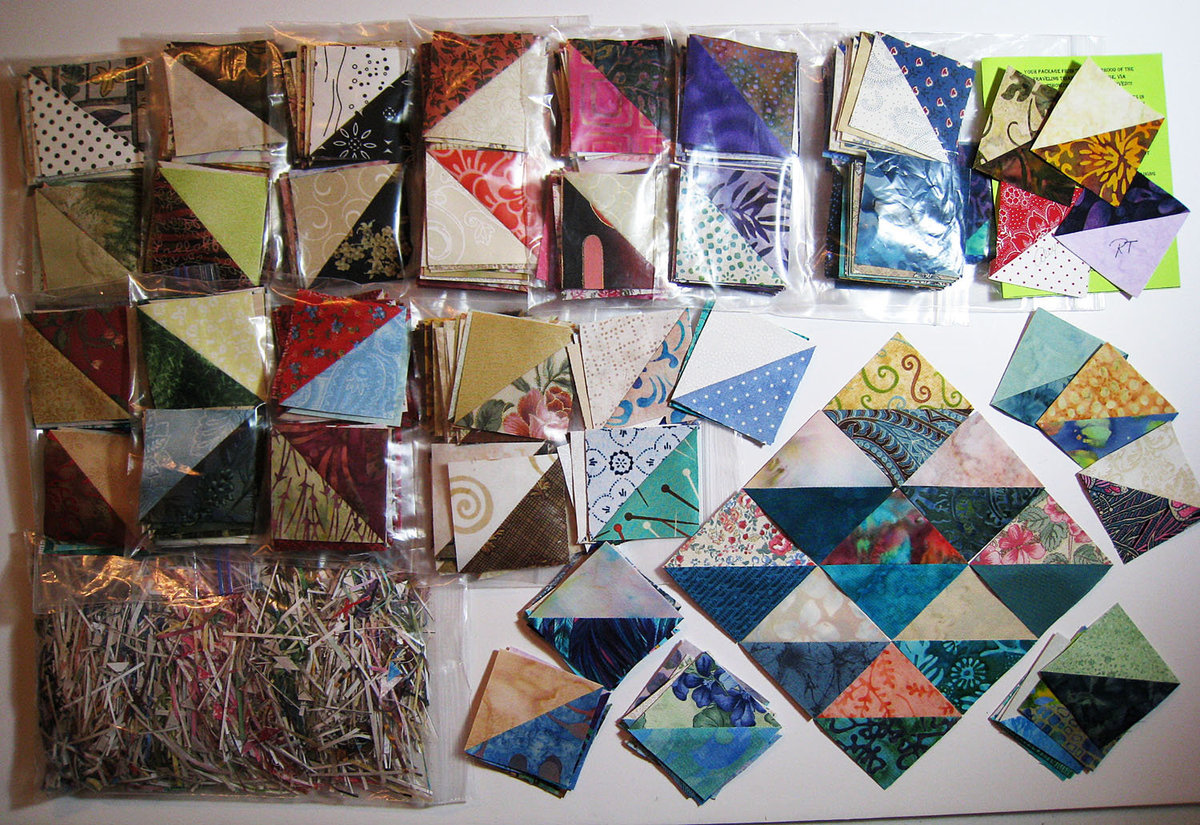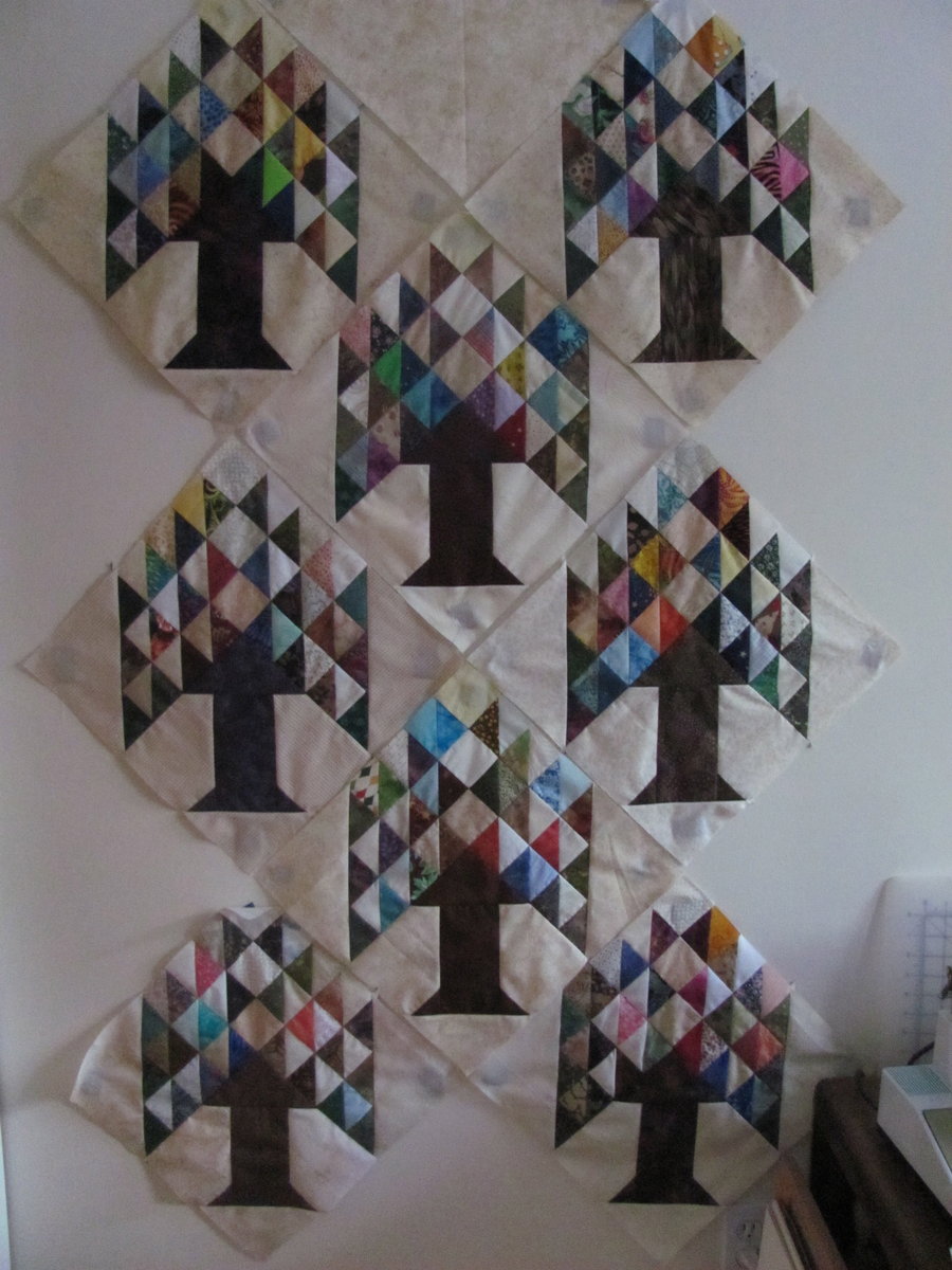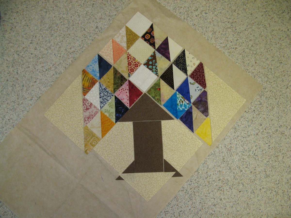 I have been playing with the HSTs this weekend and have most of them pressed and about half have the papers removed and bunny ears clipped off. I plan to make the Tree of Life Quilt from Edyta's Friendship Triangle book. This is my first block. It is not sewn as I don't have a sewing machine at the moment (yearly checkup time). I made it completely scrappy--used whichever hst I picked out of the bin. I do have different browns for the tree trunks but will use the same fabric in all the blocks for the background. I think I like it.