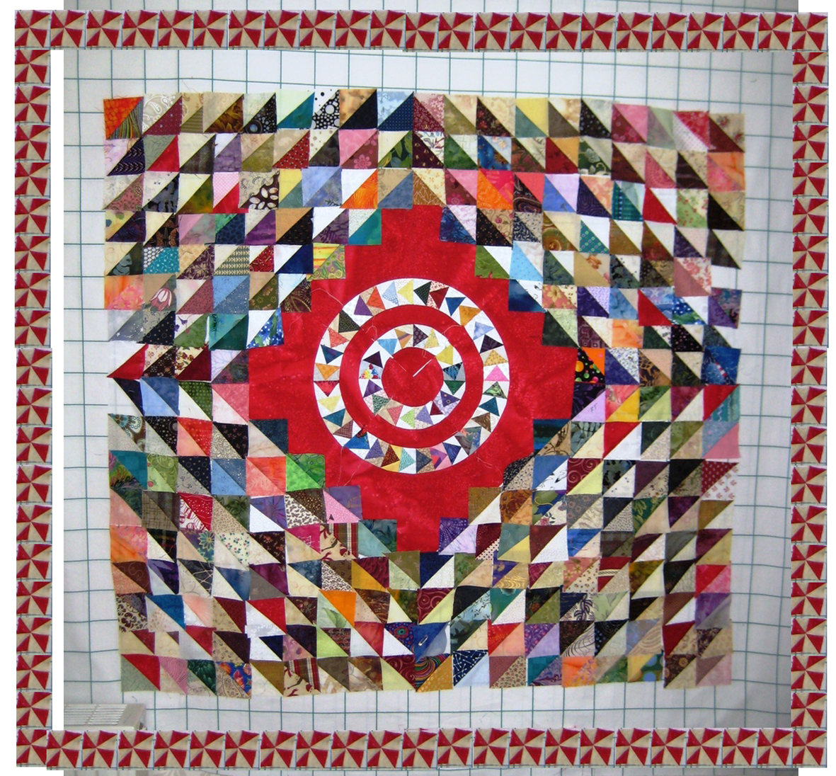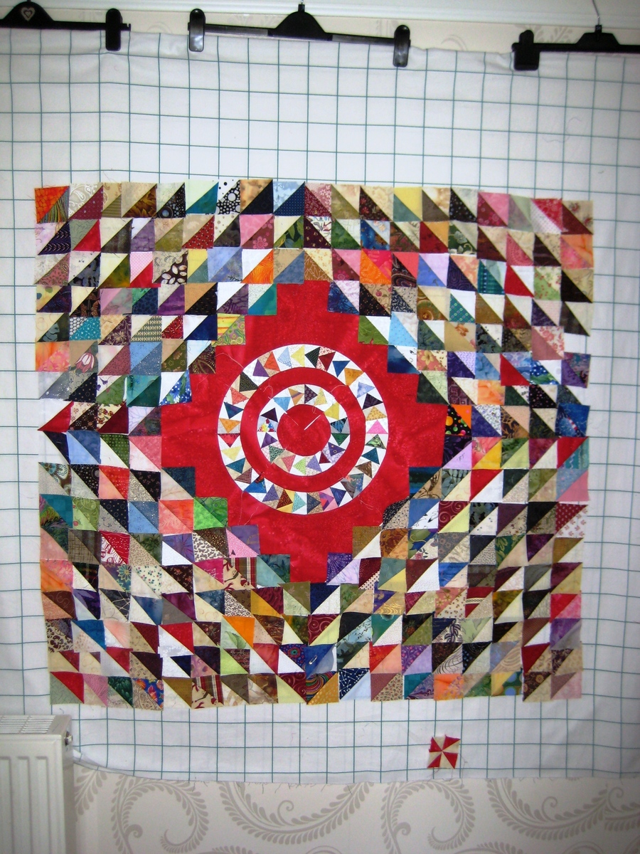 I am not sure if it works - the centre should be trimmed a bit and I need to put some red into a border. I am thinking of a red border with a waving (undulating) flying geese. But the more I look at it the more I am not sure. Any thoughts?