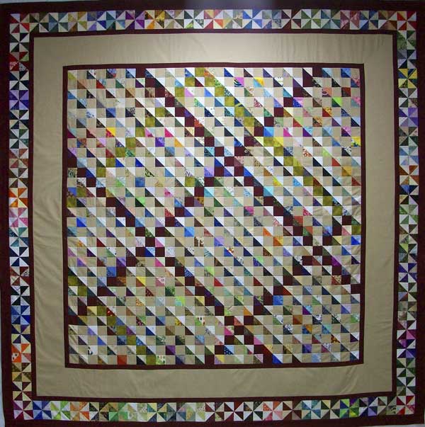 Except for getting four similar colors for each pinwheel in the border, I paid no attention at all to which HSTs went where. I was just careful about the orientation of dark/light values. If I were to do a more controlled layout, I could have made the red and green squares more dominant by choosing the colors that were next to them to give the illusion of flying geese and a bold stripe in the opposite direction. However, I like the random way it all fell into place. I was determined to work only from my stash, and the background squares and the wide border fabric were chosen because it was the only neutral that I already had with enough yardage! And....it is actually the OTHER SIDE of a fabric with a white design on a khaki base. It works for me!