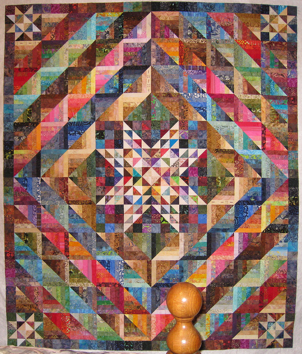 My batik quilt is going to the quilters today so thought I'd better take a picture first. As much as I would like to quilt it myself, I know I don't have the time for hand quilting and my machine quilting is mediocre and this quilt deserves the best. It doesn't have a name yet. I've got lots of time now to decide on that. The bed was in the way of the picture so I did the best I could. I will get a better one when it's completed.