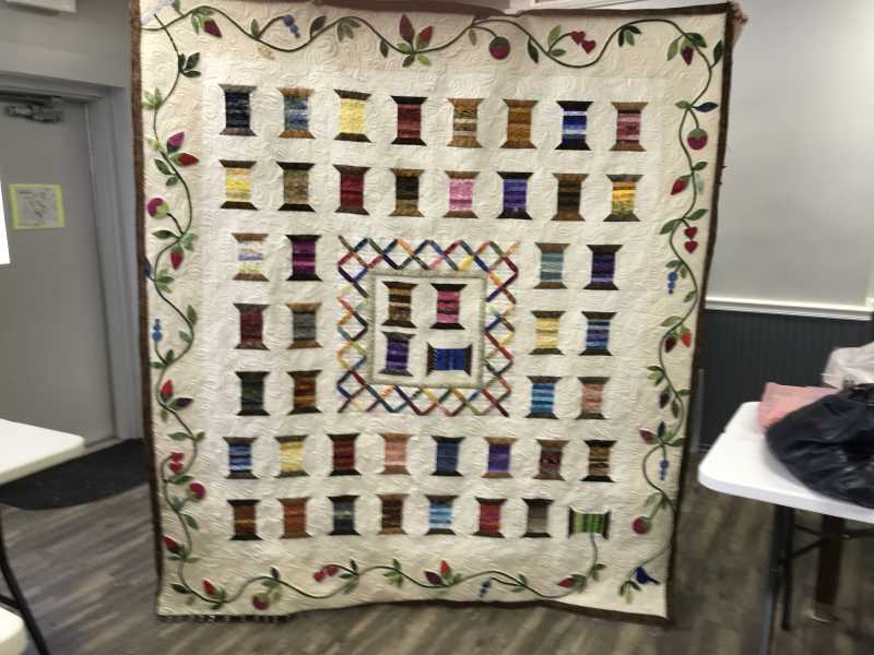 At long last I am nearly finished with my spools quilt from this exchange. I have only to finish the binding and put on the label with the names of those that made the spools. I always loved the Ruffled Roses quilt first border and decided to incorporate some of the batik strips that we also exchanged through TQS into this quilt. I will always treasure this quilt because of all the fun and excitement that prevailed while doing the exchange. Such happiness on this site!