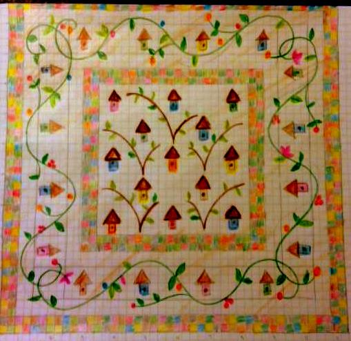 i can't post pics from my iPad which is what I normal always use but today I broke out a computer so I will hopefully post a pic of my reels, a drawing of my birdhouse block (9 x 9) and a sketch of how I might use the birdhouses in a quilt. The background would be a combination of light/medium tans similar to Edyta's quilts, the two borders would be 2 1/2 inch squares and/or hst. Here goes...