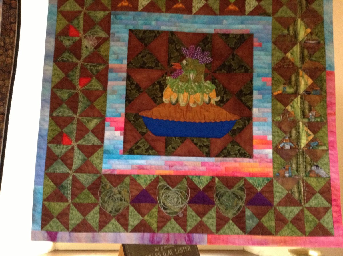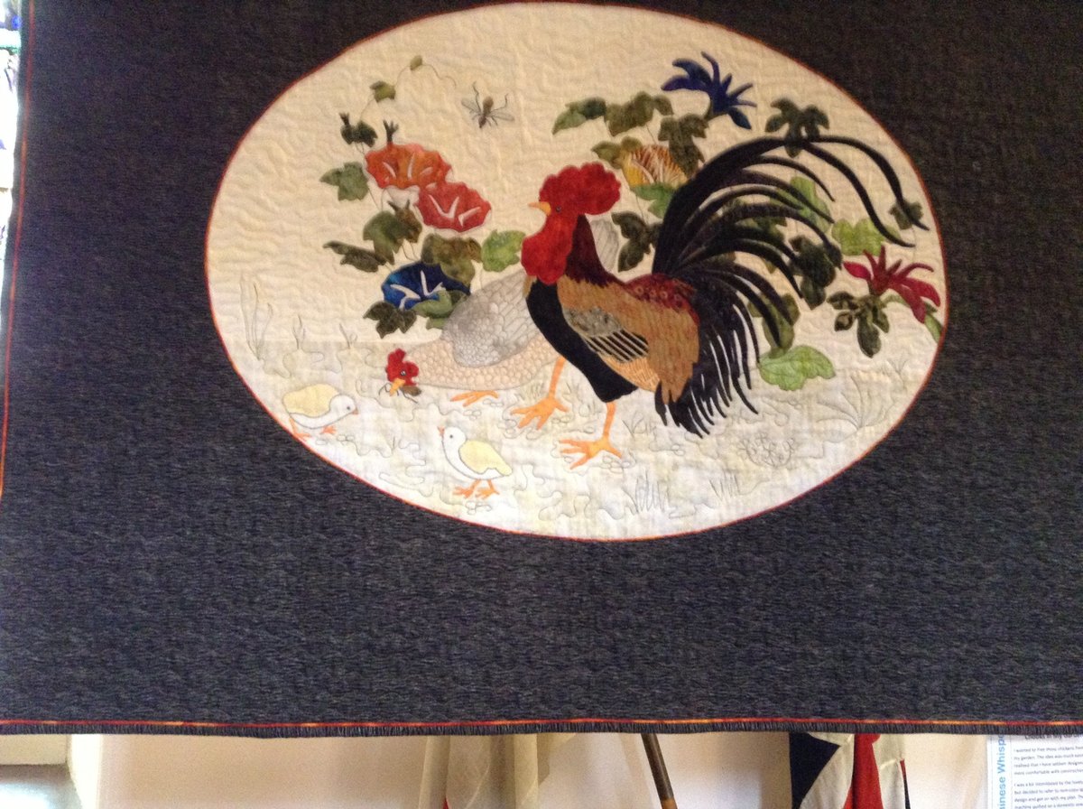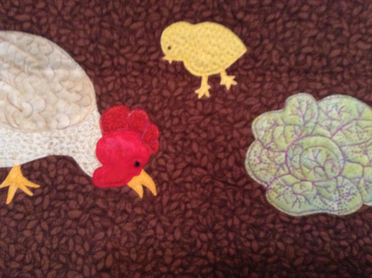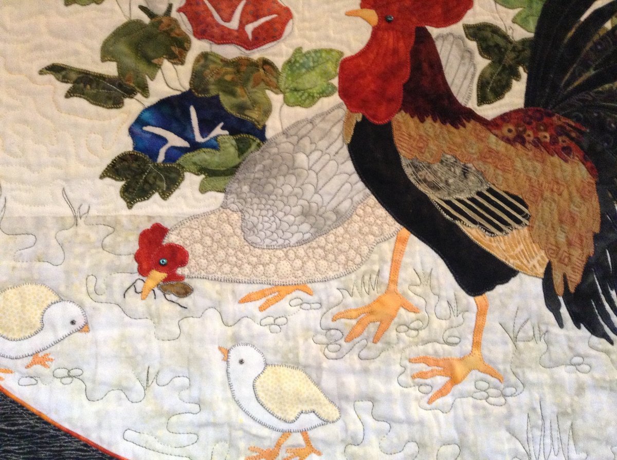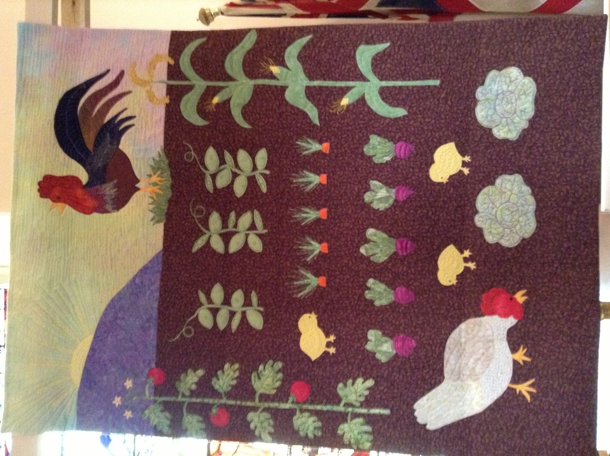 I would just like to reiterate that it was a vegetarian chicken pie (honest!) since the chicken head was made out of vegetables - maize, artichokes, carrots for the beak, a cauliflower for the eye and grapes for the wattles. Heat-n-bond to stick it down and raw edge fmq to hold it. The pie crust was shot silk, bagged out and crimped using a traditional 'Marlow' pattern from using a teaspoon to make the 3 arches.