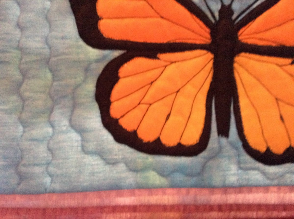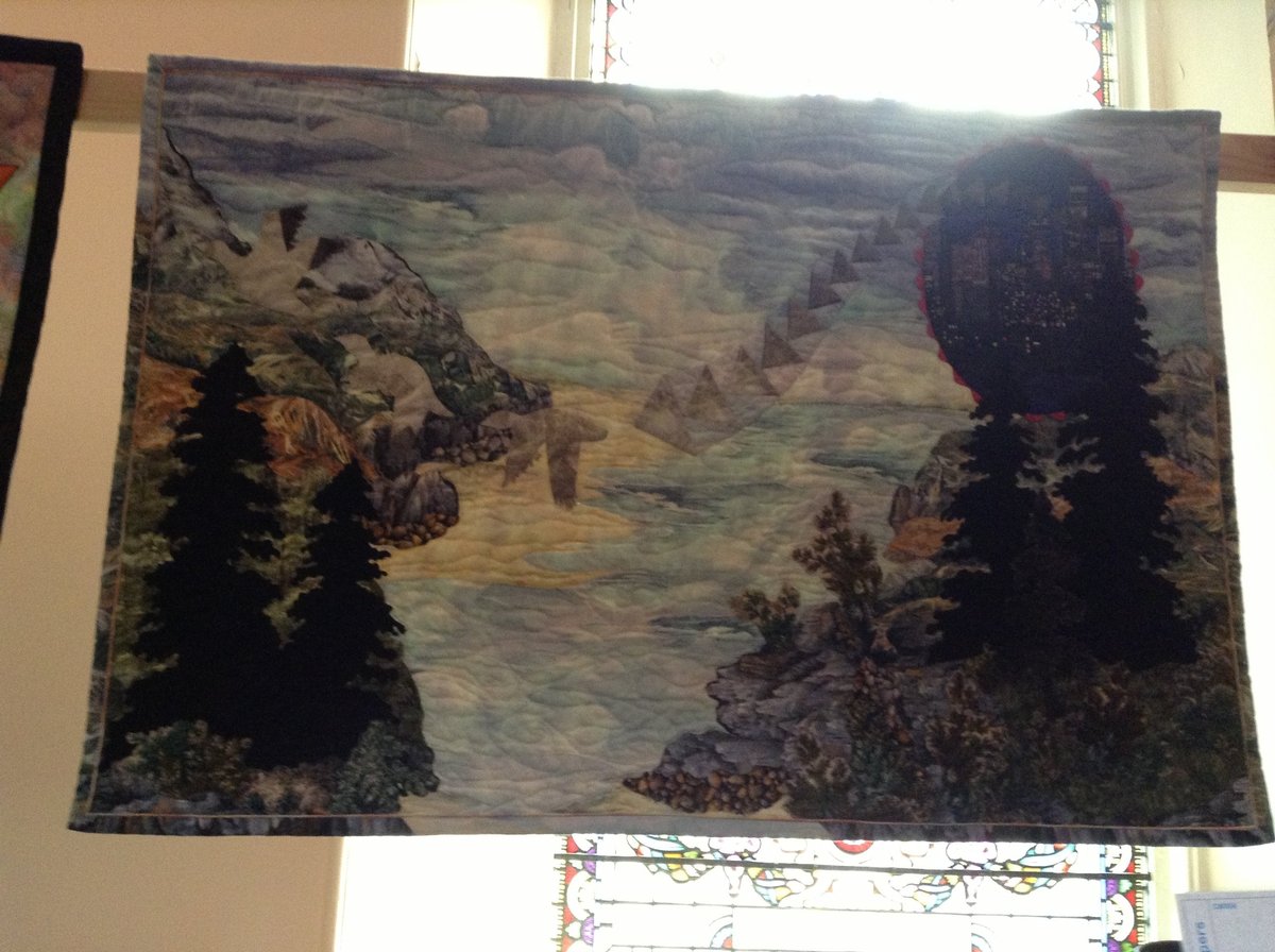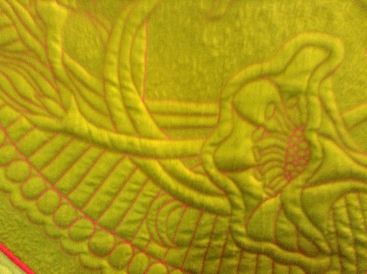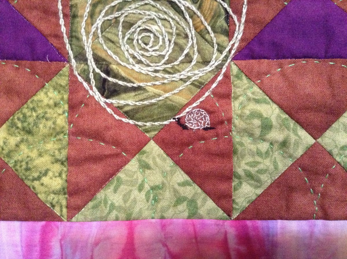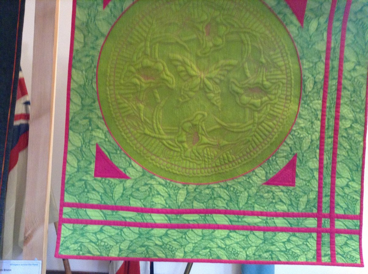 I would just like to reiterate that it was a vegetarian chicken pie (honest!) since the chicken head was made out of vegetables - maize, artichokes, carrots for the beak, a cauliflower for the eye and grapes for the wattles. Heat-n-bond to stick it down and raw edge fmq to hold it. The pie crust was shot silk, bagged out and crimped using a traditional 'Marlow' pattern from using a teaspoon to make the 3 arches.
