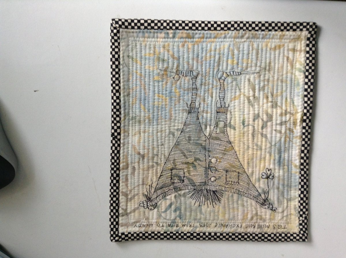 I am ultra impressed with the work on the mug rugs I have received so far. Rita - do you teach FMQ? Yours was perfect! And then there was Lois' thread painting. All of you - I feel very much the lower grade in a one-room school house! I have such a wonderfully talented bunch of Lounge Lizards around me, all in higher grades and I have many mentors. You all, plus the regular info in shows on TQS. I've made some attempts at FMQ on some of my mug rug, and they are far from perfect (like tension that gives 1000 stitches per inch), but I'm going to send them anyways.