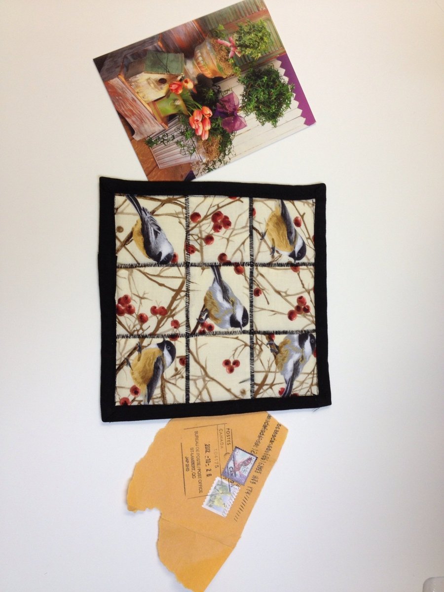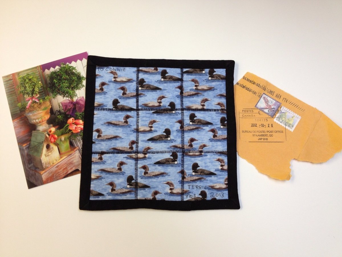 A veritable bird bonanza...chickadees on one side and loons on the other, with a bonus helping of bird stamps! Along with the mug rug, came a lesson in Canadian currency. Did you know that the $1 Canadian coin has a loon on it, and is called a "loonie"?