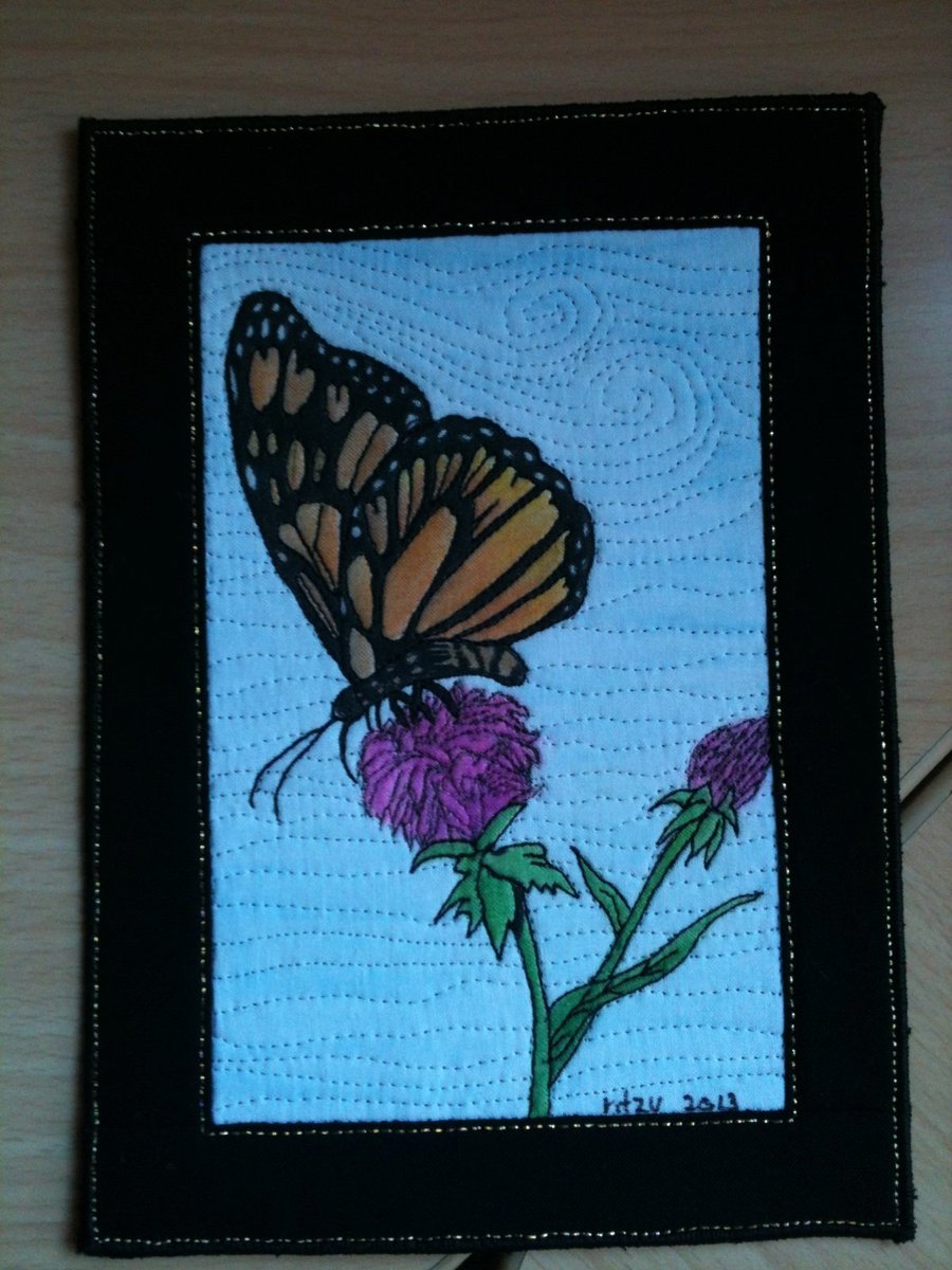 Ladies, you give me too much credit. The butterfly was in a Dover book and so copyright free to use, I traced it onto fabric, used colored pencils and fabric medium to color it, my machine to stitch around every black line with Superior Bottom Line and then machine quilted the background. Thanks for all the praise though--feels good to know others appreciate my work.