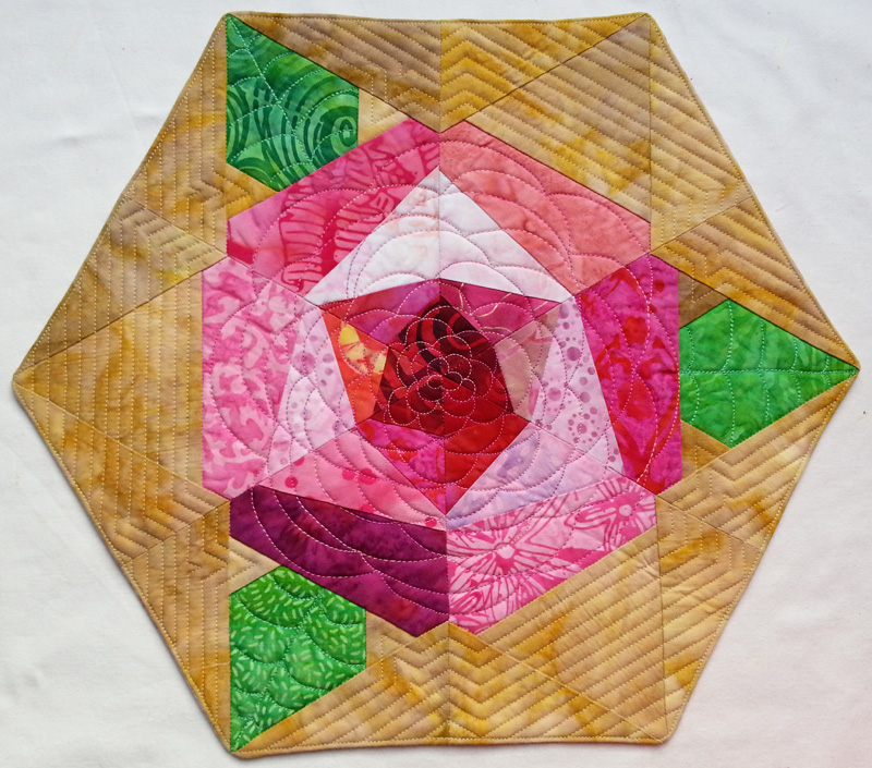 It wasn't made using hexies, but it is one large paper-pieced hexie itself. I used a pattern that I happened across in QuiltMaker magazine last spring. I picked it up to look at while taking care of my mother and it ended up being a very useful issue since it's also where I got the idea for Rita's mug rug!