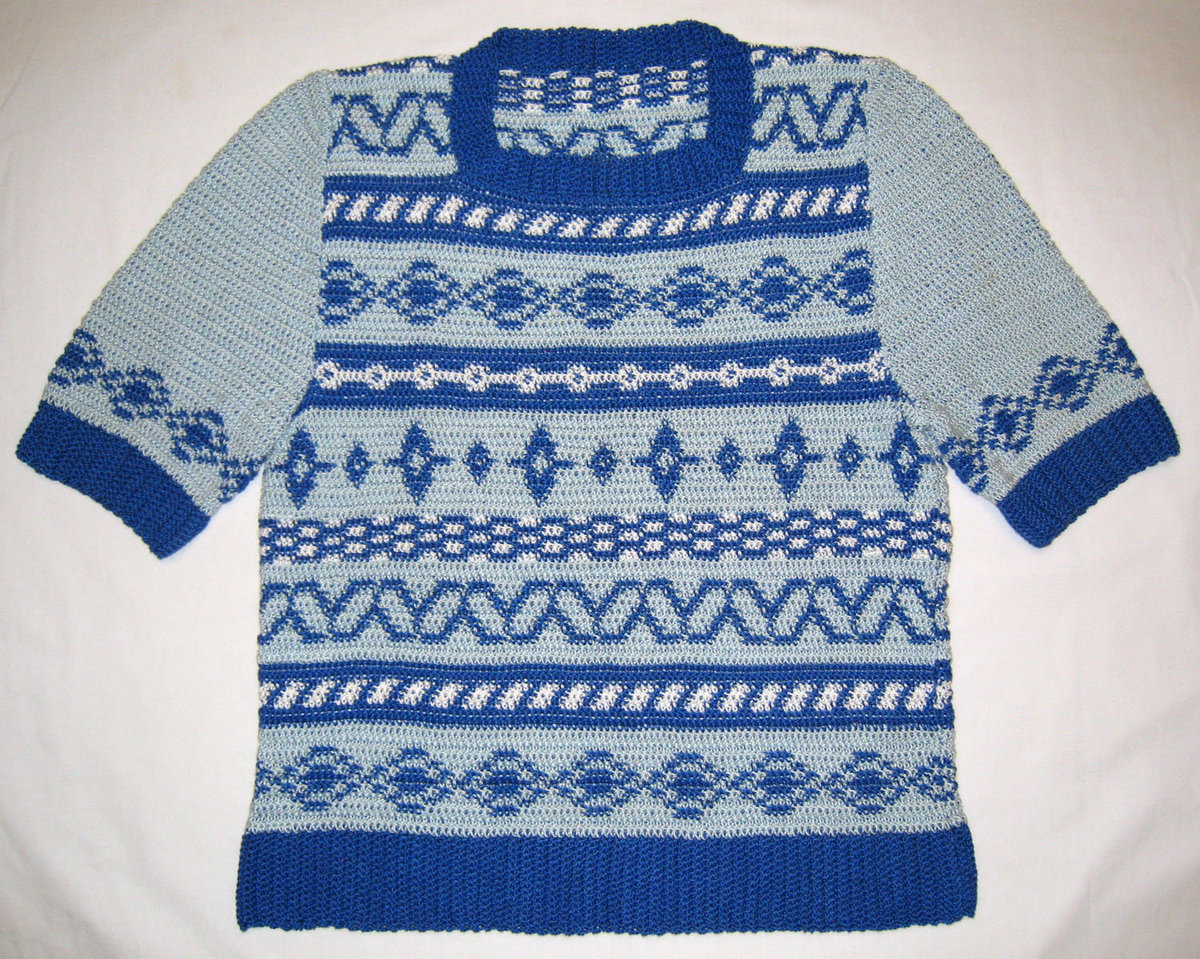 I'm enjoying seeing all of the creative mug rugs. Wish I had time to join you. I remember knitting a sweater 40 some years ago. The process was too slow for me, but I did crochet a few sweaters in the early '80s. This is the only one I kept. It was an original design and a finalist in a McCall's magazine contest. I have a Polaroid picture of me wearing it somewhere. There's no chance of that happening again because it will no longer fit over my head. Do you suppose I should hand it down to my oldest DGD who is 11 before she outgrows it if she hasn't already!