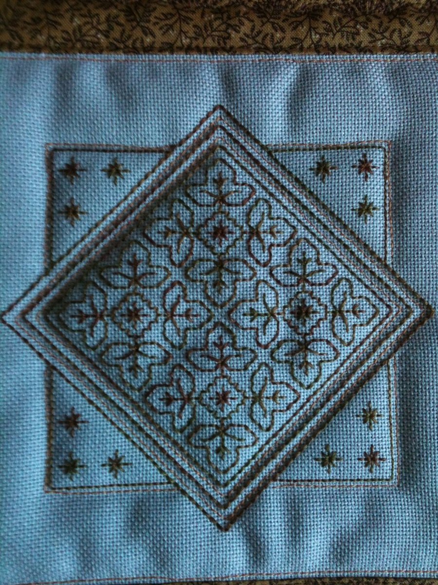 Ok Lorchen, I am so embarrassed to have thought the beautiful work in the center of my mug rug was cross stitch! Elizabethan Blackwork! I have to admit I've never heard of it before. Thank you for teaching me something new!