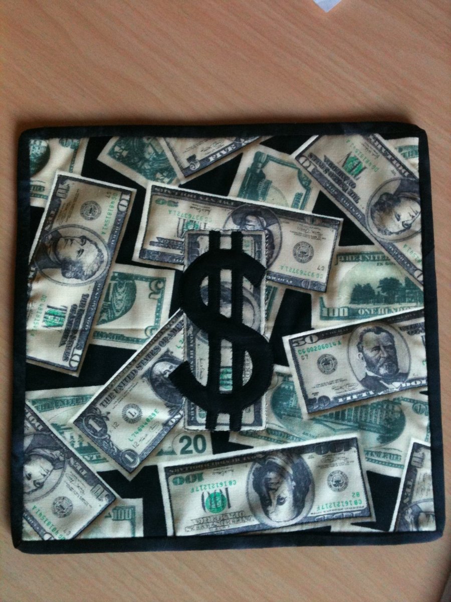When I sent my 2013 smilebox of quilts to my son he asked me what a mug rug was. I explained it to him. Then I thought, maybe he should see a mug rug! I had this money fabric I had bought for him. (He's a CPA, Financial Planner, money guy). What best to put on the money fabric than a dollar sign? I think he'll get a kick out of it. If nothing else, it will be a "coaster" no one else will have!