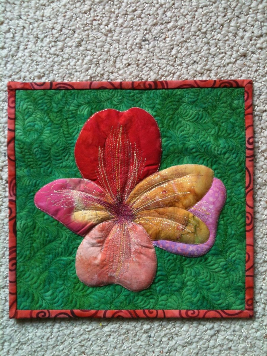 How lucky am I? Check out this beautiful spring flower that Nancy made for me! Nancy says it's from a picture she took in Peru. Nancy is an amazing thread painter and FMQ-er. The tiny little feathers are exquisite. The flower is trapunto-d and is 3-D. I love the colors, Thank you so much Nancy!!!