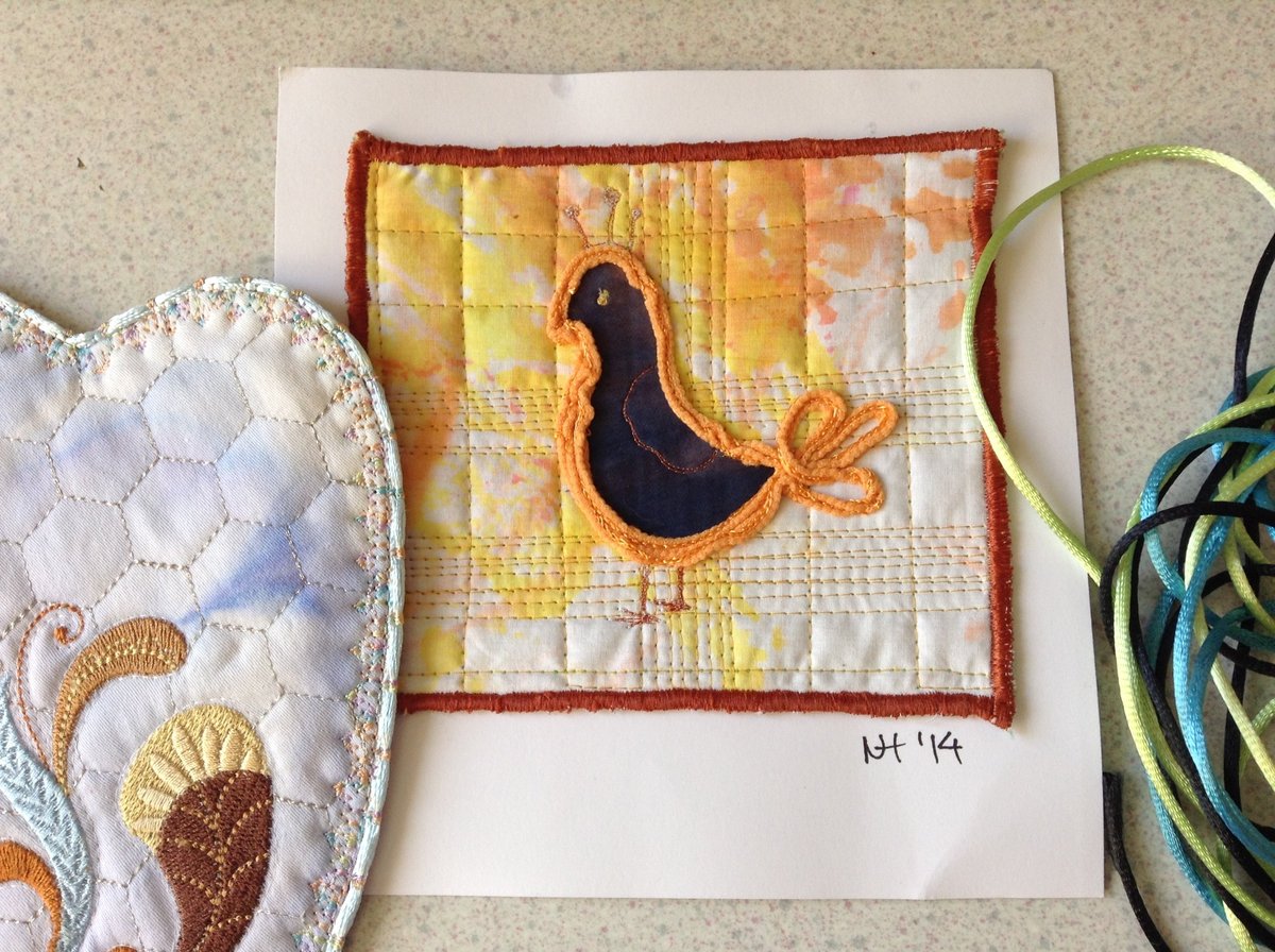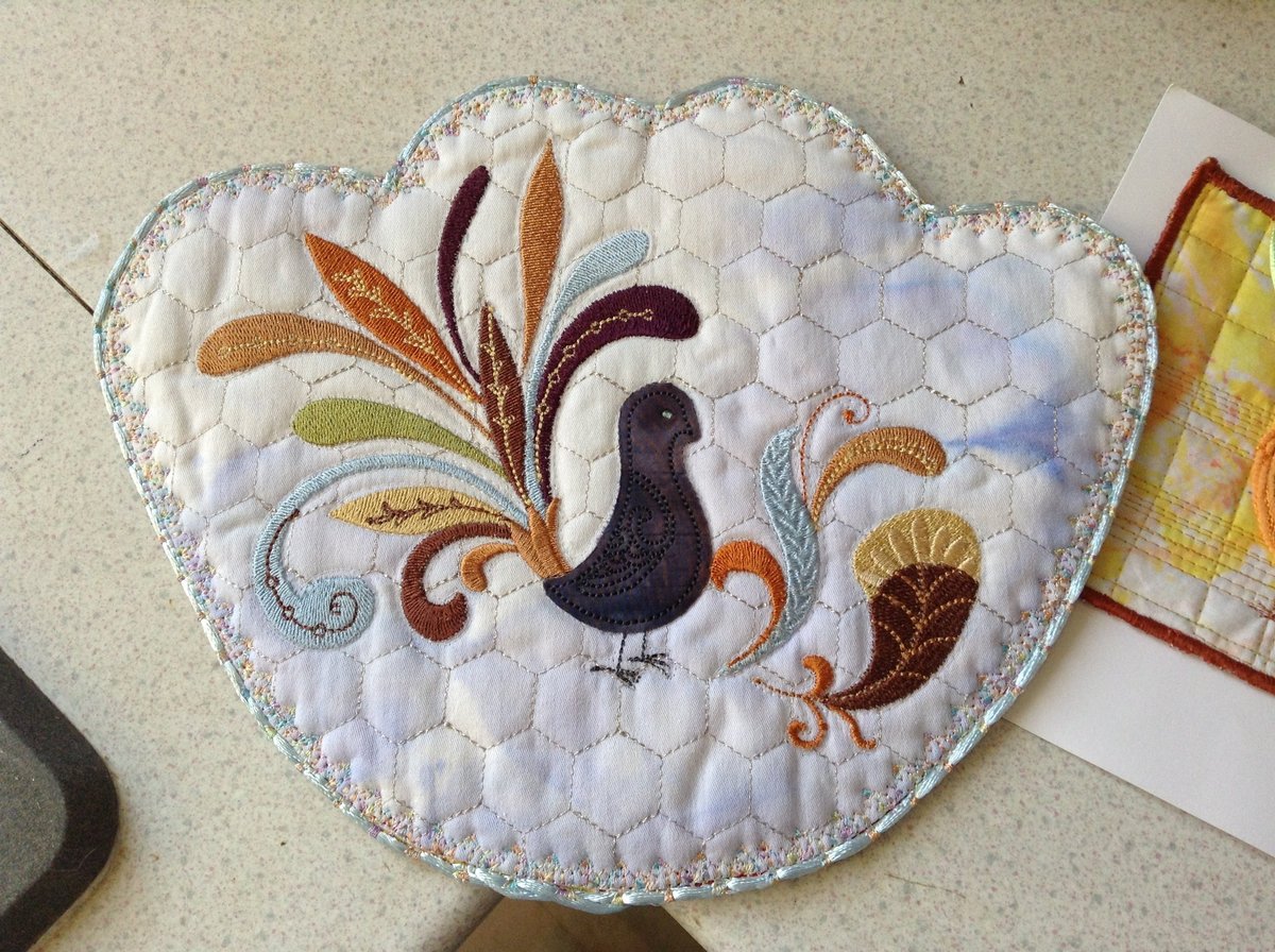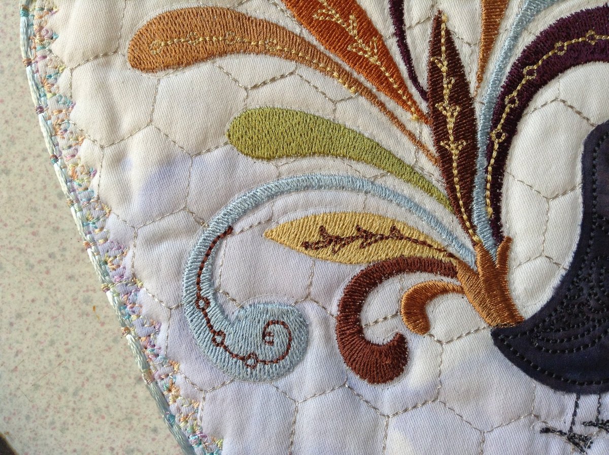 The chicken wire was made as a background on the rug. I have just gotten the DesignWorks from Bernina and wanted to try designing in it, so I drew the wire with hexagons and let the program figure out how to sew it. I have to practice a bit more because it was difficult to line up the hexagons perfectly, but I thought chicken wire sometimes is not perfect so I let it go. It is embroidered on my Bernina 830 with Wonderfil thread which I find difficult to use. It's not a strong metal thread so I had a few breakages though I set the machine on very slow. After that I embroidered the bird on top of the wire.