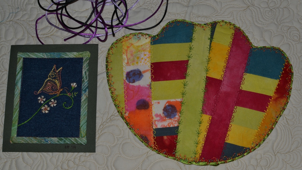 Diving into the contents of the mailbox yesterday, I encounter a large envelop, hand addressed to me, in the middle of the junk & bills. My first reaction was "oh no, what now?" until I felt what I was sure was fabric, then noticed 3 beautiful stamps that said Danmark on them. The contents of the envelop, obviously from Norma, have me grinning from ear to ear. Norma sure is the queen of machine embroidery! A beautiful butterfly, a bright, happy mug rug of hand-dyes embellished with embroidery and 3 long pieces of beautiful rat-tail (I think that's what you call it), are lifting my spirits. The border of the mug-rug has this cording embroidered to the edge.