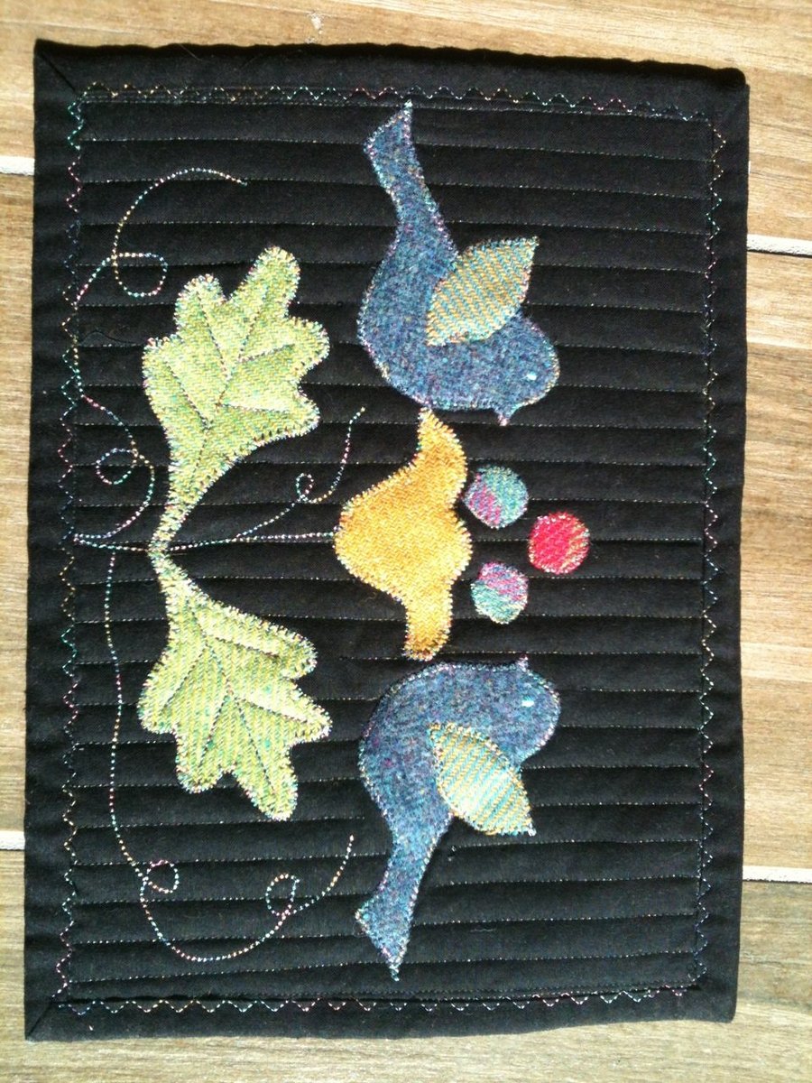 Here is a picture of it. It is wool appliqued on a perfectly quilted background. See the binding treatment? Cool! Rita says it is "two lovebirds for you two love birds." Thanks Rita I love it.