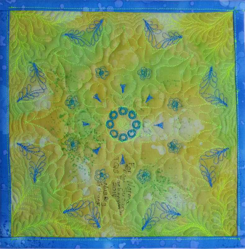 Sue has used one of her doodles to create this and painted it with intense pencils and quilted it on her sit-down longarm machine. It's very well done.