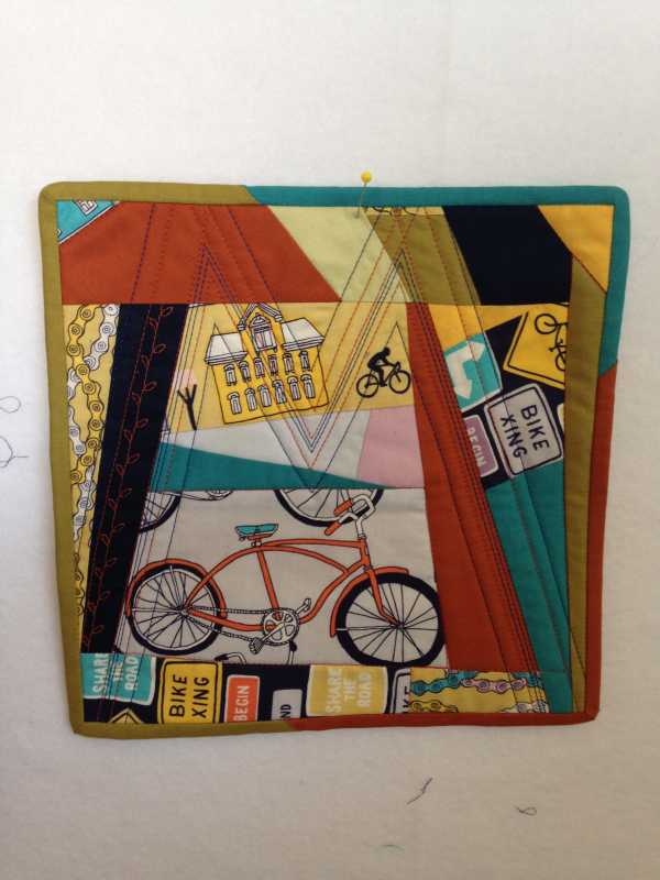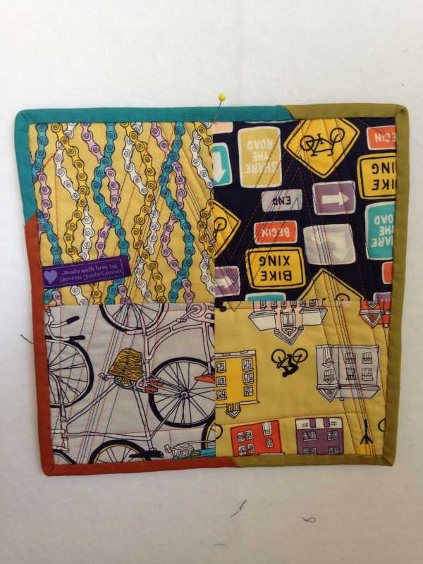 While shopping for curtain fabric at the hoarder lady quilt shop I came across some cycling fabric. My oldest son is quite the bike rider. He rides many miles. (I keep trying to explain to him that it's quicker to drive his car! :dry: ) In any case, I bought 4 quarter yard cuts and made him a mug rug. I hope he will like it.