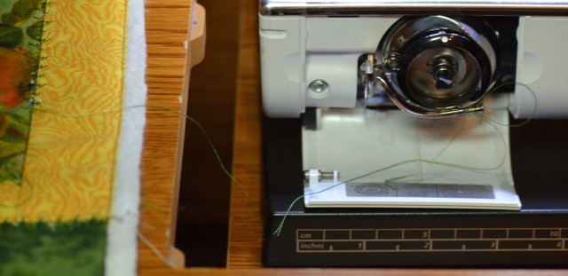 Wendy, The mugrug I am doing for you is not finished yet. My Bernina has been very bad lately. It greedily gobbles up thread in the bobbin case area and won't let it go. I had to take it back to the dealer. It stopped in the middle of a row of decorative quilting on your mugrug. (See below) So it will be a little longer. I am sorry about that.