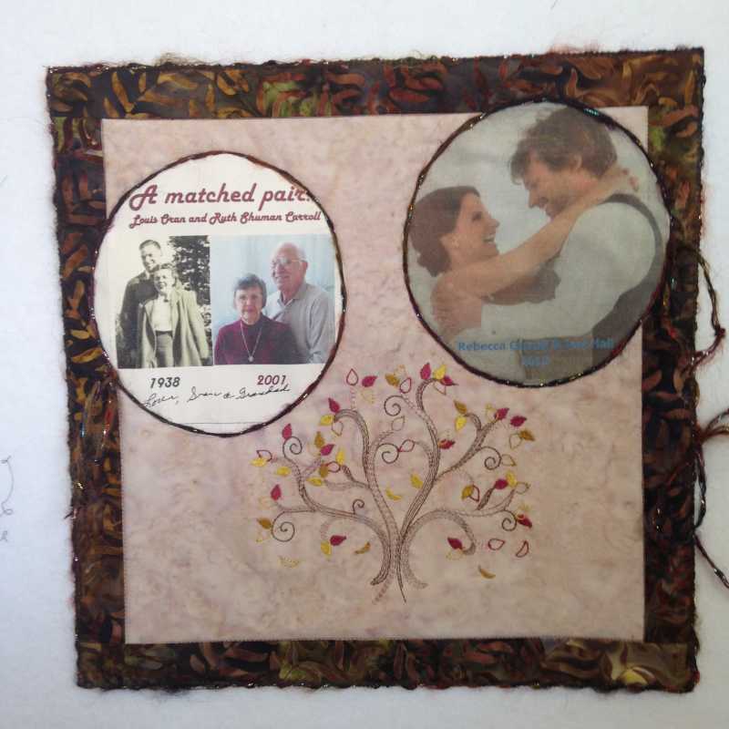 In any case, here it is. Not the most artistic mug rug I've made, but it's very special. Several years ago I had my mother in law sign these pictures of her and Grandad thinking that I would use them for the grandkids when they got married. Both Gran and Grandad have passed away. When the topic "Roots" came up, I knew this would fit. Then I remembered I had 4 embroidered trees that I didn't use as planned. Viola! It all came together. I mailed it off to my niece, however I haven't heard anything back yet.... :S