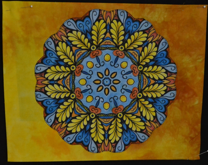 Obviously, influenced by Kaleidoscope Kreations show #..., I used one of my "zentangles", scanned, printed on Jacquard cotton, probably from Dharma Trading, then colored with Derwent Inktense pencils, used my color wheel to help choose colors.