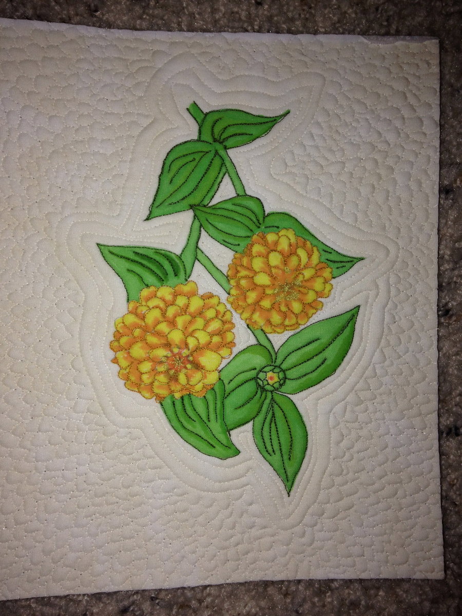 My CW Challenge quilt is called "Yesterday a Flower Bloomed". Actually this one bloomed in my garden last summer. I drew it from a photo and colored it with Tuseniko Pens and then add just a little free motion embroidery.