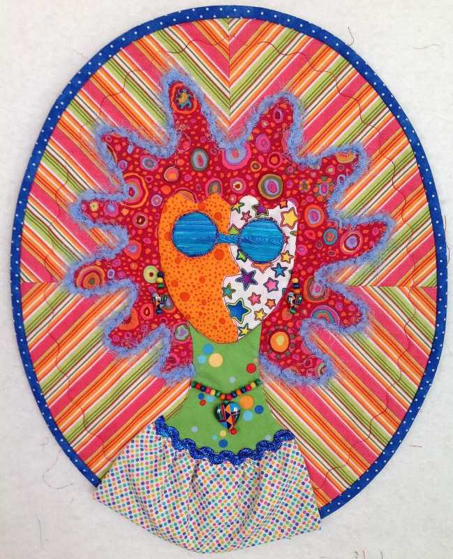 . Actually, when I made that, I was still working full-time but also trying to be a full-time quilter so I often felt frazzled and torn. I sure had fun making that piece, though, and I've received an honorable mention in 2 quilt shows (one local, one regional) with it. Here's a photo of just the quilt—I hope (all that's showing up in preview is words). It's about 13 inches x 16 inches.